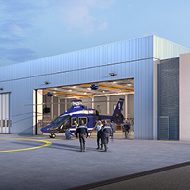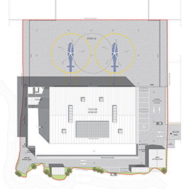 Le hangar constitue le cœur fonctionnel du projet. Positionné dans l’axe de la zone de stationnement des aéronefs, il garantit des déplacements directs, lisibles et sécurisés. Son organisation intérieure privilégie la fluidité des manœuvres et le confort d’usage, renforcé par des apports généreux de lumière naturelle et des transparences visuelles avec les espaces adjacents.